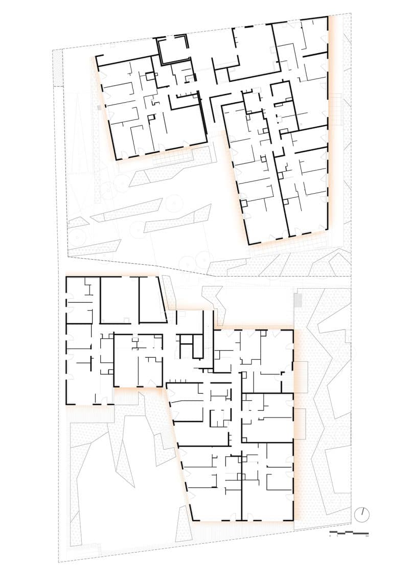 L’ensemble prend place dans une ZAC, et le projet a bénéficié d’échanges soutenus avec l’architecte de la Ville de Rennes, Vincent Cornu. L’ilot, mêlant logements en accession et logements sociaux, a été conçu dans un souci de cohérence visuelle et conceptuelle. La composition fragmentée, en L qui se répondent, permet aux deux bâtiments de s’imbriquer tout en préservant pour chacun des angles de vue sur le canal et les prairies. Le socle commun contribue encore à unifier l’ilot, et s’inscrit dans la continuité du canal. Il est pensé comme une plate-forme qui surplombe l’ancien chemin de halage désormais rue Armand Rébillon, et couvre l’ensemble des stationnements dont l’accès commun est situé rue de Plaisance. La façade Est est rythmée par de grands balcons aux tailles et profondeurs irrégulières, comme des tiroirs entrouverts dont la variété donne de l’épaisseur à l’épiderme du projet et fait écho au paysage multiple qui l’entoure. La façade Sud est dotée d’une double peau qui assure la fonction de brise-soleil. L’ensemble bénéficie d’une unité de ton dans sa partie arrière, avec, en contrepoint, le coloris bronze de la façade Sud qui vient faire écho aux constructions en schiste rouge, traditionnellement associé au pays rennais, qu’on retrouve le long de la rue Rébillon.