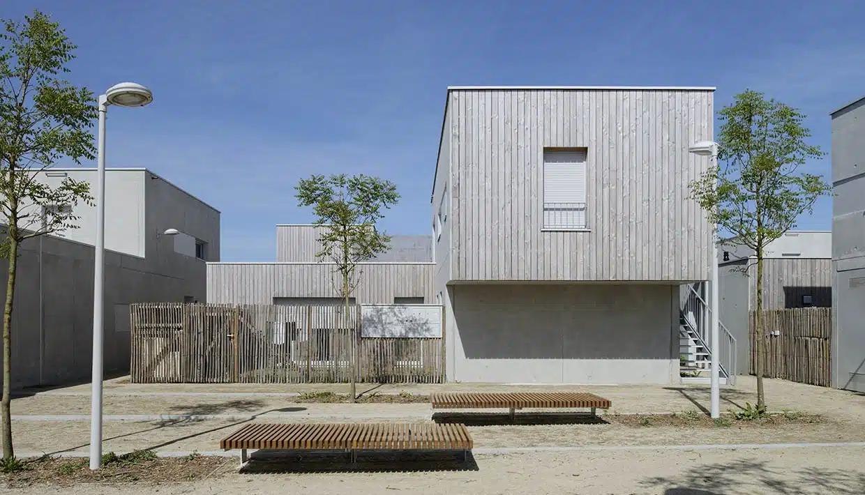 Une fois ce principe posé, chaque habitation trouve place. Constitué d’un module d’habitat variant du T3 au T5, c’est le positionnement et l’articulation des modules entre eux qui rythment l’opération. L’échelle, la régularité et la simplicité constructive – béton lasuré habillé de bois sur les cours jardins – soulignent paradoxalement à la fois le caractère singulier mais collectif de chaque ‘maison’.