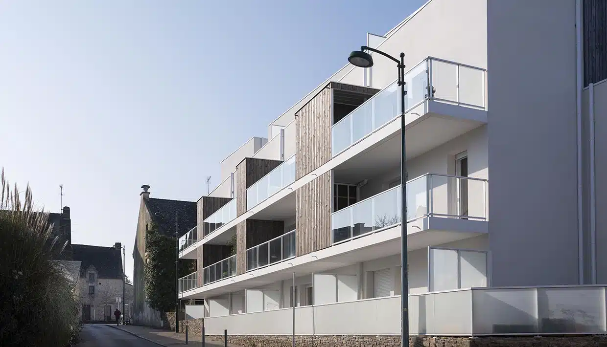 Les teintes des volumes principaux sont claires, en cohérence avec le paysage bâti de la presqu’île de Rhuys. Les attiques sont fragmentés et habillés de lames de châtaigner. La livraison de l’opération a été suivie par une remise à neuf des espaces publics du quartier.