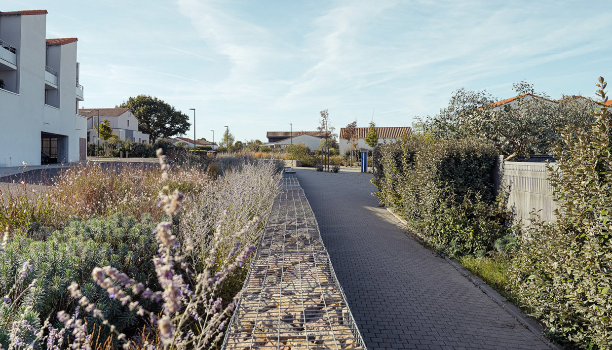 Le masterplan s’appuie sur le patrimoine bocager existant composé principalement de haies champêtres (aubépines, chênes, pins…), sur la topographie naturelle, et sur la «coulée verte» le long du Tharon.