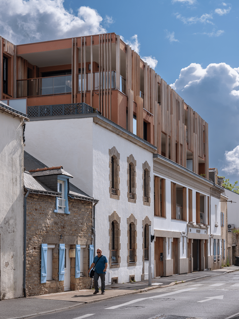 La sublimation d’un des rares héritages Art Déco encore présent dans le Morbihan a stimulé la conception architecturale du projet et motivé la stratégie de positionnement « premium » de la résidence. Beaucoup de recherches et de mises au point ont été effectuées, pour comprendre et restituer l’architecture et les modes de faire des années 30, caractéristiques de la Belle Époque : frise, ornements 3D, motifs floraux, finitions lisses et désactivées…