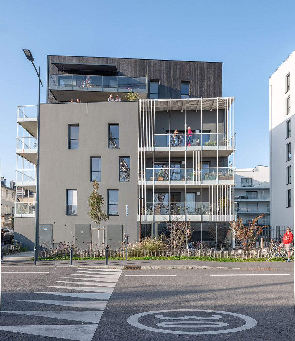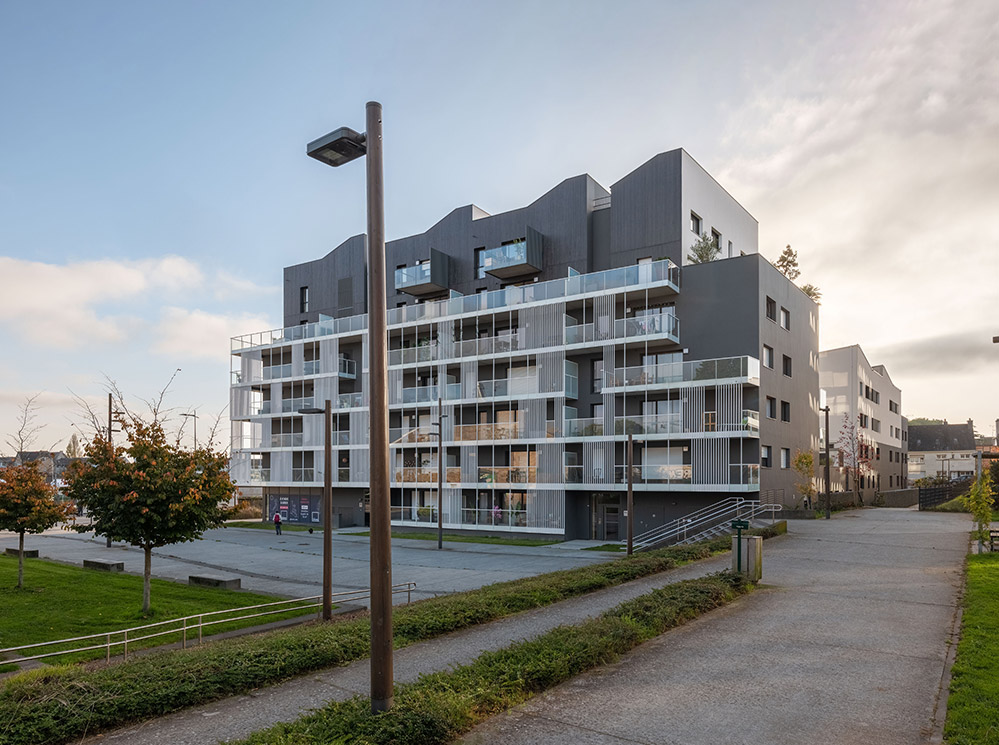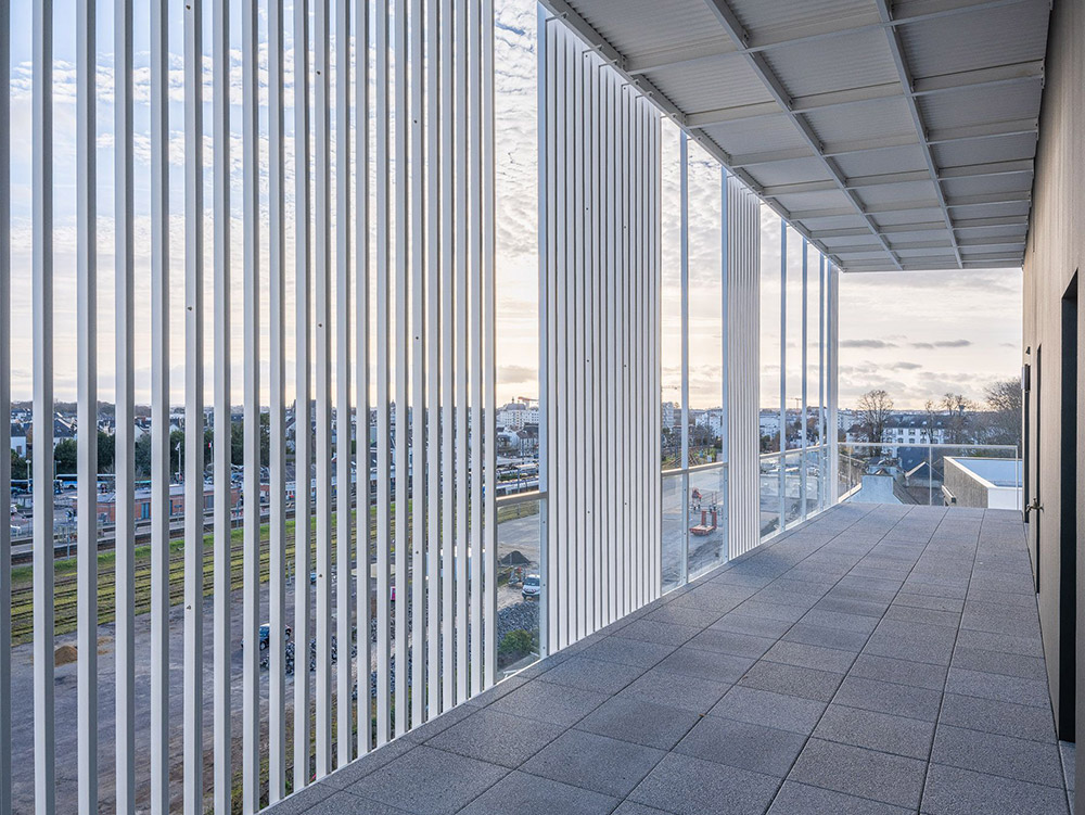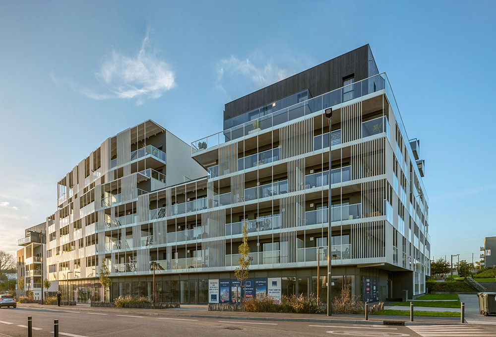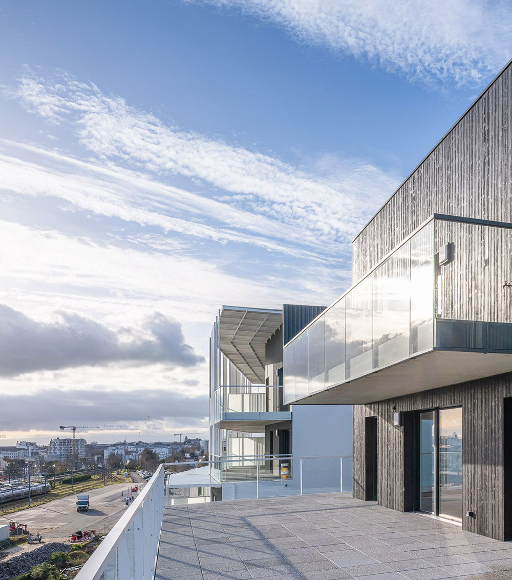 Des balcons filants et des terrasses privatives équipés d’un système de double peau métallique blanche prolongent le séjour vers l’extérieur afin de procurer aux résidents une haute qualité d’usage.